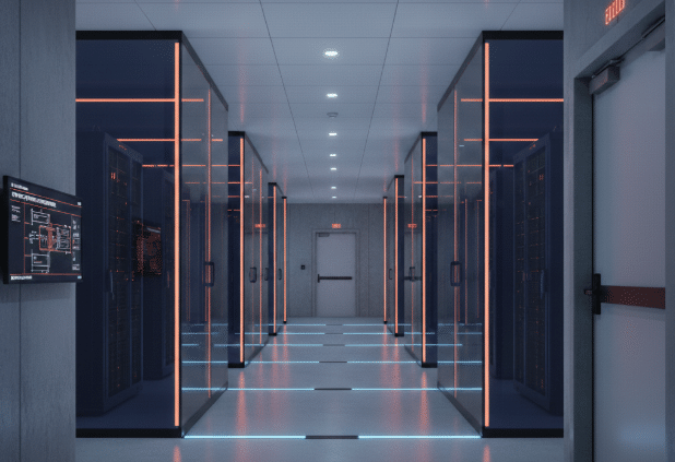 How OEM Engineers Can Prevent Fire Spread, Downtime, and Compliance Failures? A modern data center aisle with glass-front server cabinets and LED lighting. The Overlooked