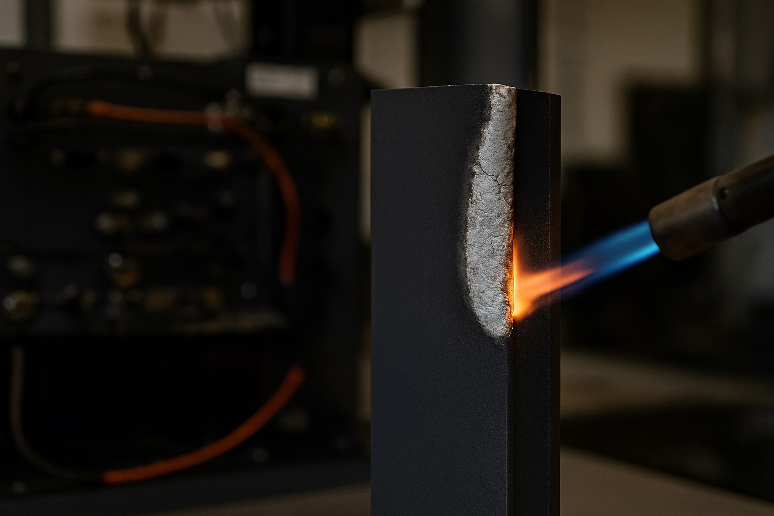 This video demonstrates a torch test comparing two materials’ fire resistance and thermal management capabilities.